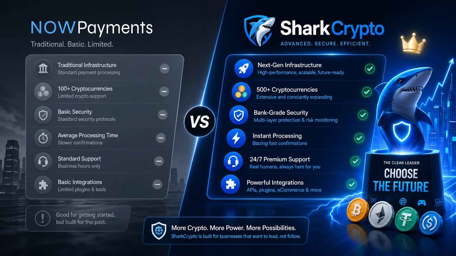 NOWPayments, хотя и является достойным решением для новичков, не может конкурировать с инновационными возможностями SharkCrypto. Для тех, кто хочет не просто принимать криптовалюты, но и использовать их как мощный инструмент для роста и развития бизнеса, выбор очевиден: SharkCrypto — это будущее криптопроцессинга.